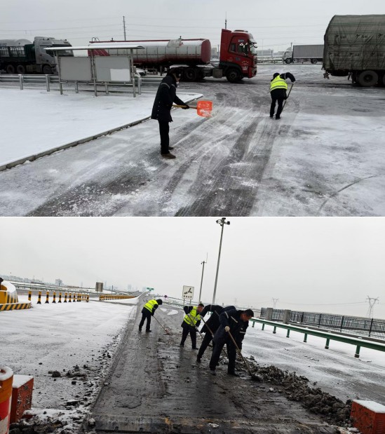 此次行動嚴格遵循“先保通、后保暢”和“除雪為主、融雪為輔”原則,人員、物資、機械設備提前部署就緒。引導車、大型專業(yè)鏟雪作業(yè)車、融雪劑撒布車、預警車組成作業(yè)梯隊,有序開展聯合作業(yè),重點對橋面、互通匝道、彎道等易滑路段加大融雪物資撒布量,并駐人盯防強化處置效果。各收費站率先開展人工除雪,全面清理車道、廣場及站區(qū)積雪,同時安排人員前置指揮疏導限行車輛、引導車流有序通行,提升通行效率;道路養(yǎng)護中心隨后對收費站內外廣場、匝道口等關鍵區(qū)域開展深度鏟冰除雪,徹底消除安全隱患。