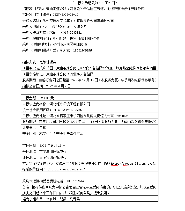 津汕高速公路(河北段)各站區(qū)空氣源、地源熱泵維修保養(yǎng)服務(wù)項(xiàng)目中標(biāo)公告