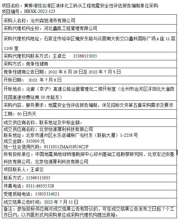 黃驊港綜合港區(qū)液體化工碼頭工程地震安全性評估報告編制單位采購成交結果公告