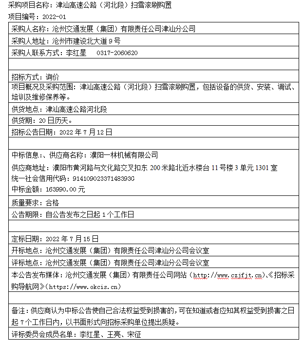 津汕高速公路(河北段)掃雪滾刷購(gòu)置中標(biāo)公告